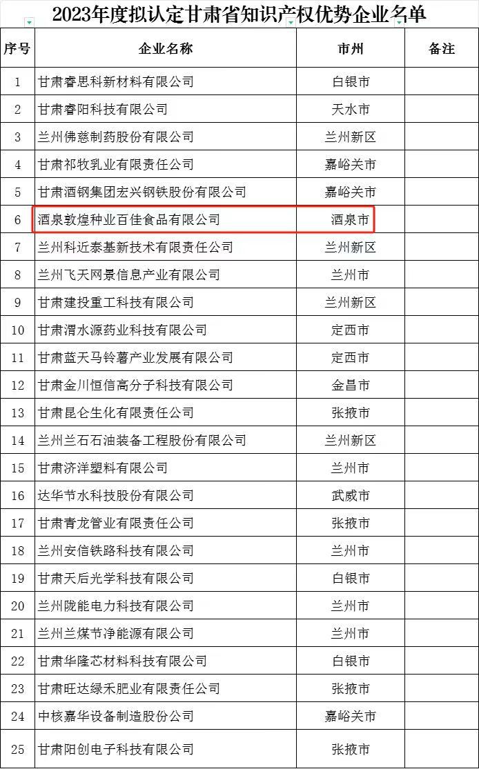 喜訊傳來!酒泉敦煌種業(yè)百佳食品有限公司榮獲“甘肅省知識產(chǎn)權優(yōu)勢企業(yè)”稱號